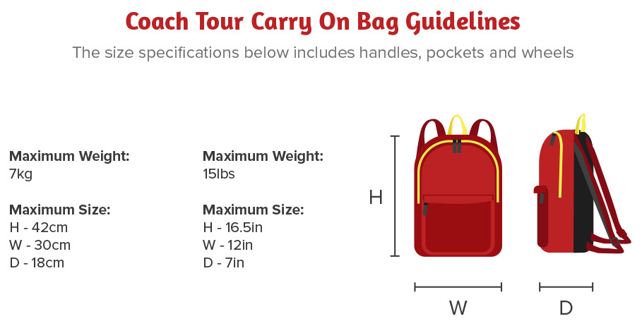 You may bring a carry-on bag, also known as a daypack, with you on the coach. This will hold everyday things you may need while travelling and sightseeing such as water, a camera, sunscreen, a hat etc. Maximum dimensions for carry-on bags for the coach are 42cm x 30cm x 18cm.
