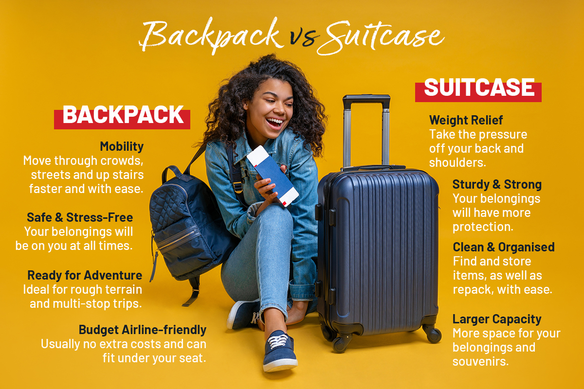 Wheeled suitcases are the most common suitcases used on tour, but backpacks are also popular among younger travellers. Both options have their pros and cons to consider: